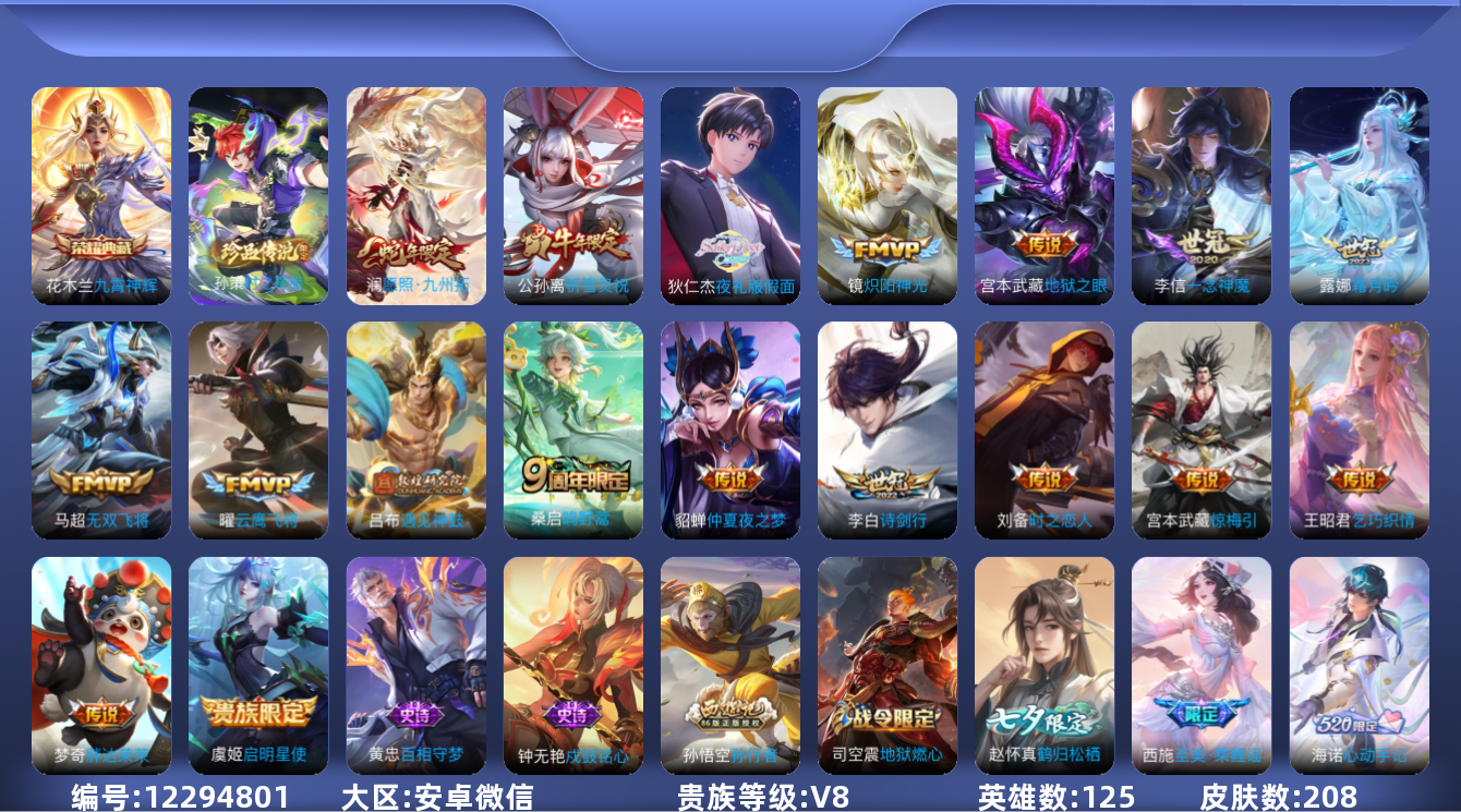 嬴政-摇滚巨星,嫦娥-拒霜思,娜可露露-晚萤,狄仁杰-鹰眼统帅,李元芳-逐浪之夏,凯-曙光守护者,雅典娜-冰冠公主,兰陵王-暗影猎狩者,廉颇-地狱岩魂,刘禅-绅士熊喵,吕布-圣诞狂欢,孙尚香-水果甜心,赵云-未来纪元,澜-赏金猎手,雅典娜-黎明之约,司马懿-暗渊魔法,百里玄策-原初追逐者,孙尚香-时之恋人,橘右京-修罗,不知火舞-魅语,大乔-猫狗日记,程咬金-功夫厨神,蔡文姬-舞动绿茵,夏侯惇-乘风破浪,刘邦-德古拉伯爵,花木兰-水晶猎龙者,吕布-末日机甲,妲己-魅力维加斯,宫本武藏-鬼剑武藏,露娜-紫霞仙子