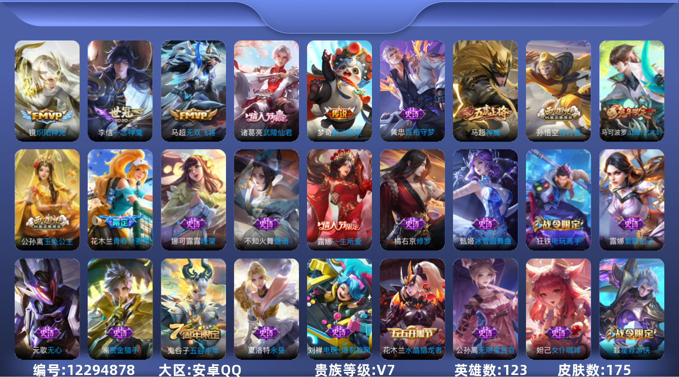 嬴政-摇滚巨星,嫦娥-拒霜思,娜可露露-晚萤,狄仁杰-鹰眼统帅,李元芳-逐浪之夏,百里守约-特工魅影,诸葛亮-黄金分割率,兰陵王-暗影猎狩者,廉颇-地狱岩魂,吕布-圣诞狂欢,孙尚香-水果甜心,赵云-未来纪元,澜-赏金猎手,夏洛特-永昼,雅典娜-黎明之约,百里玄策-热力回旋,百里玄策-原初追逐者,橘右京-修罗,不知火舞-魅语,公孙离-无限星赏官,孙策-猫狗日记,阿珂-节奏热浪,白起-星夜王子,蔡文姬-舞动绿茵,亚瑟-心灵战警,夏侯惇-乘风破浪,刘邦-德古拉伯爵,花木兰-水晶猎龙者,宫本武藏-鬼剑武藏,露娜-紫霞仙子,墨子-金属风暴